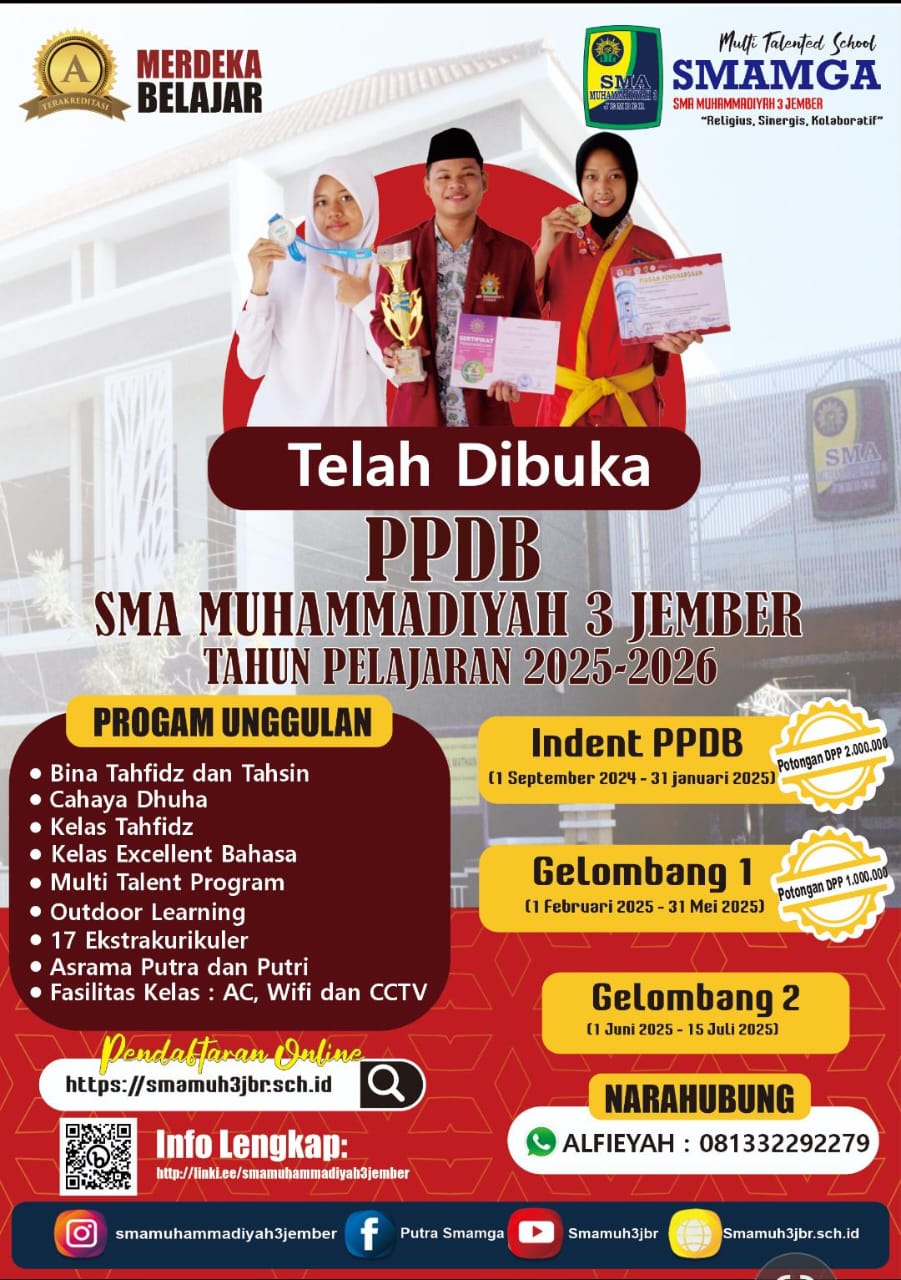 JEMBER, enewsindo.co.id - SMA Muhammadiyah 3 Jember kembali membuka kesempatan emas bagi para lulusan SMP/MTs yang ingin melanjutkan pendidikan di sekolah berbasis religius dan kolaboratif. Pendaftaran peserta didik baru (PPDB) Tahun Ajaran 2025/2026 kini diperpanjang hingga 24 Juni 2025 untuk gelombang pertama, dengan penawaran istimewa berupa potongan biaya pendidikan sebesar Rp1.000.000 bagi calon siswa yang mendaftar sebelum batas waktu tersebut.