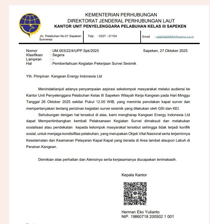 Dalam surat bernomor UM.03/22/4/UPP/Spk/2025 yang diterima media ini, Syahbandar Batu Guluk meminta PT Kangean Energy Indonesia (KEI) Ltd. untuk menghentikan kegiatan survei seismik 3D di perairan Kangean demi menjaga kondusivitas masyarakat.