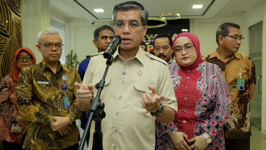 Yassierli Menteri Ketenagakerjaan di dampingi pegawai dari Kemenaker merangkan kepada Media (Humas Kemenaker untuk enewsindo)