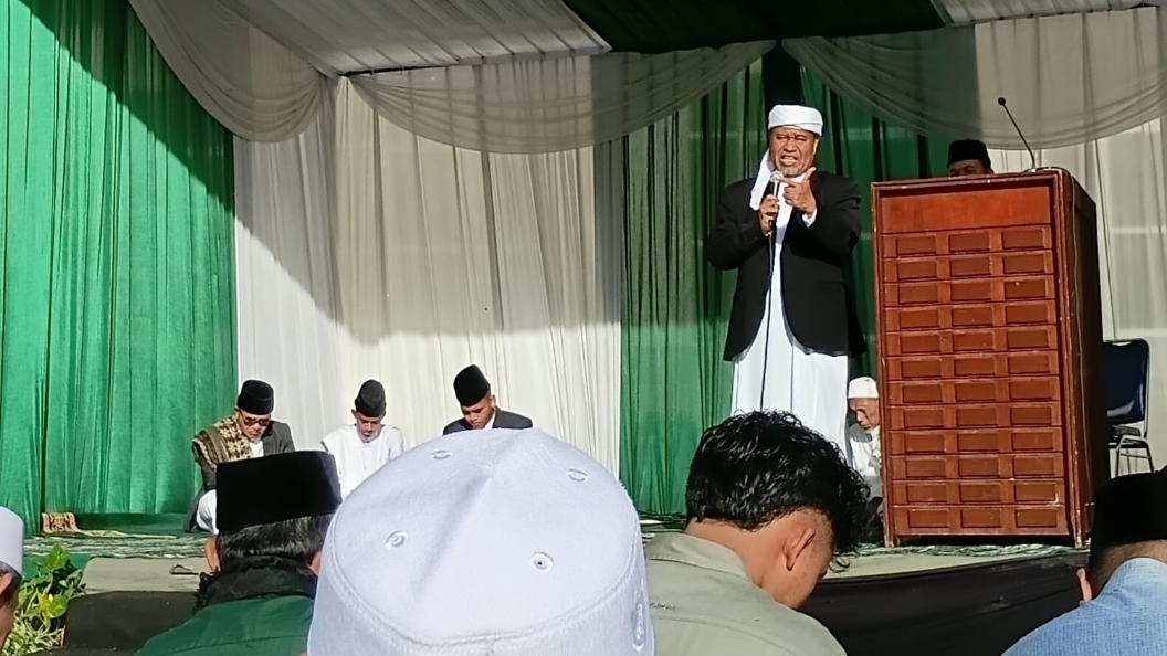 Pimpinan Ponpes Al Islah, KH Thoha Yusuf Zakaria Ma’shum ketika memberikan Tausiyah di hadapan Jamaah sholat idul Fitri (Eko)