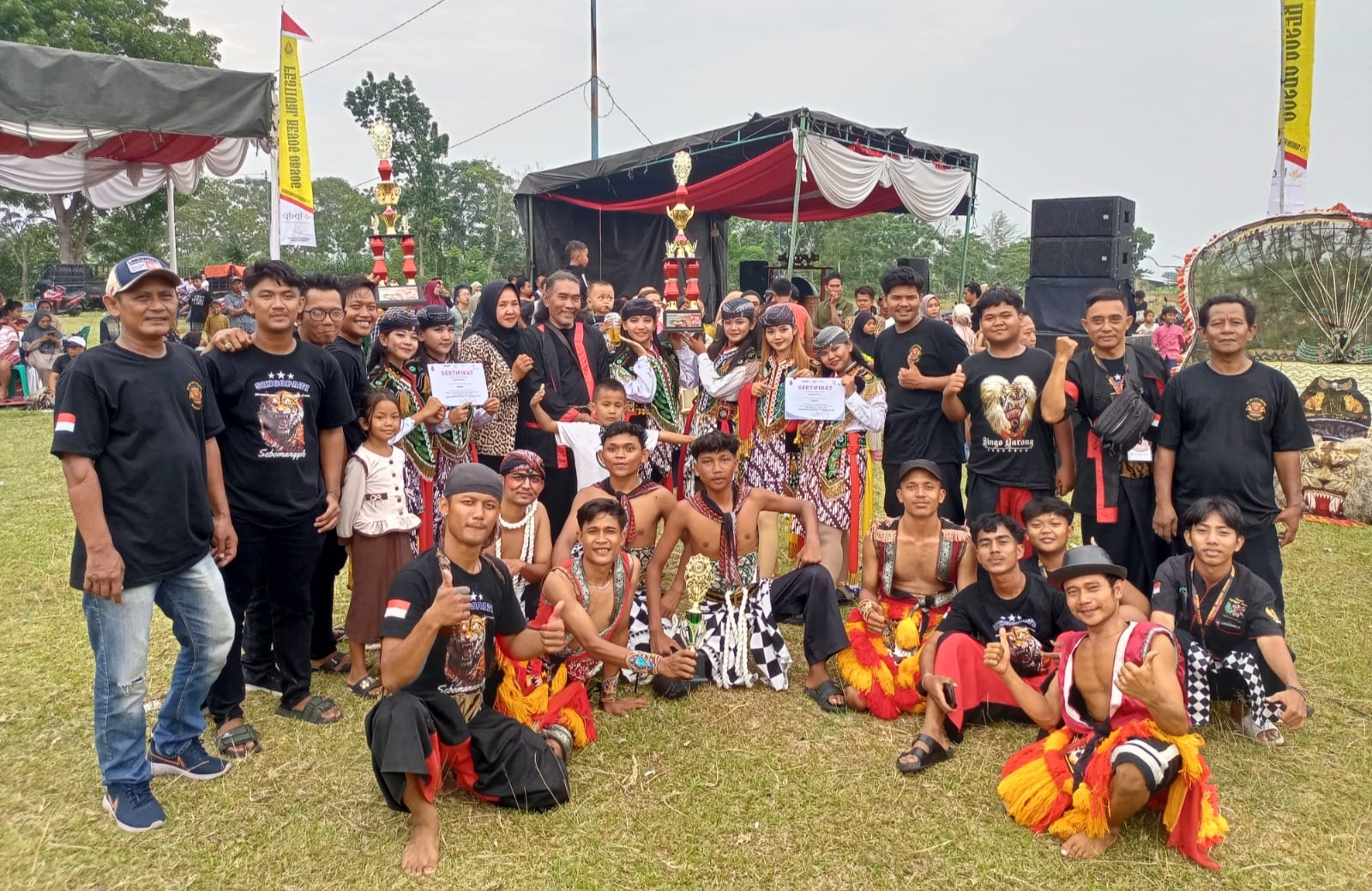 Puncak acara menjadi momen yang paling ditunggu. Saat nama Sanggar Seni SINGOPATI SEBOMANGGOLO diumumkan sebagai Favorit Terbaik festival, suasana langsung bergemuruh. Tepuk tangan, sorakan, dan teriakan kebanggaan bersahutan dari berbagai penjuru lapangan.